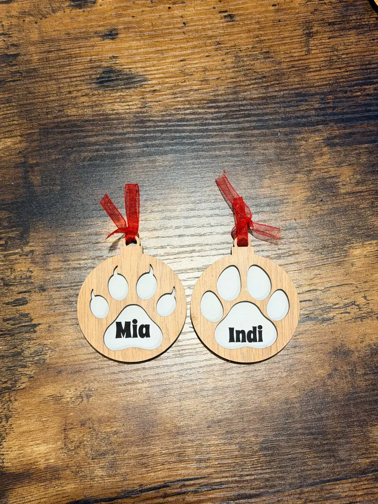 El nombre de la mascota, impreso en negro en la almohadilla central de la huella, consigue un acabado limpio, legible y muy estético. - Completa el diseño una cinta roja translúcida, perfecta para colgarla en el árbol, en una corona o en cualquier rincón navideño.