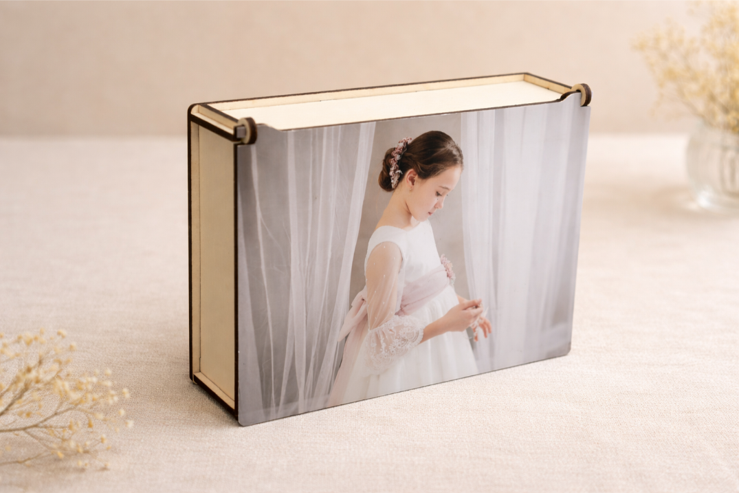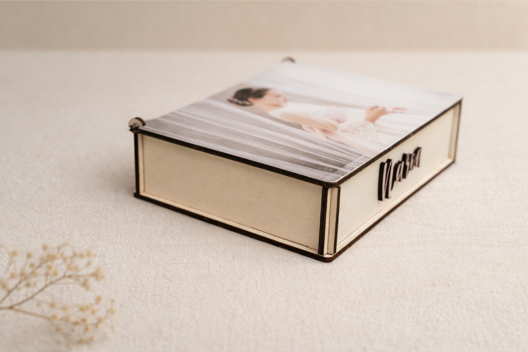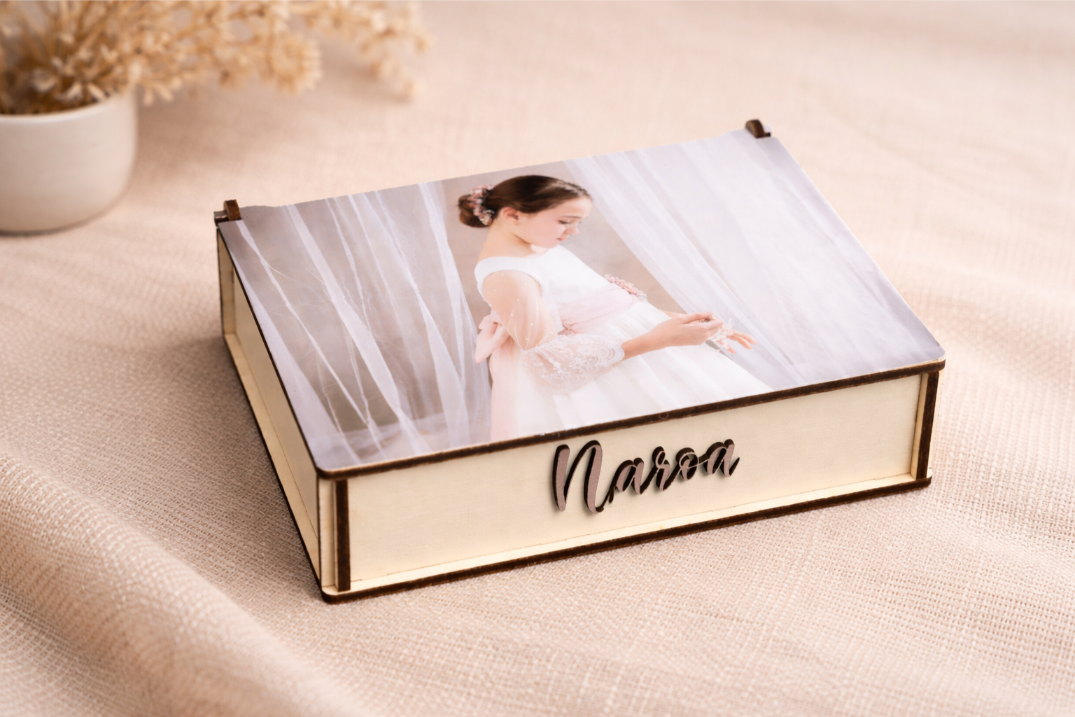 • Grabado del nombre en el lateral: Además de la foto en la portada, puedes grabar un nombre o una fecha significativa en uno de los laterales de la caja, añadiendo un toque personal y exclusivo.
