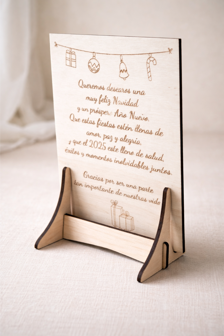 Hecha en madera de alta calidad, esta tarjeta no es solo una felicitación, sino un recuerdo duradero que puede decorar cualquier rincón del hogar.