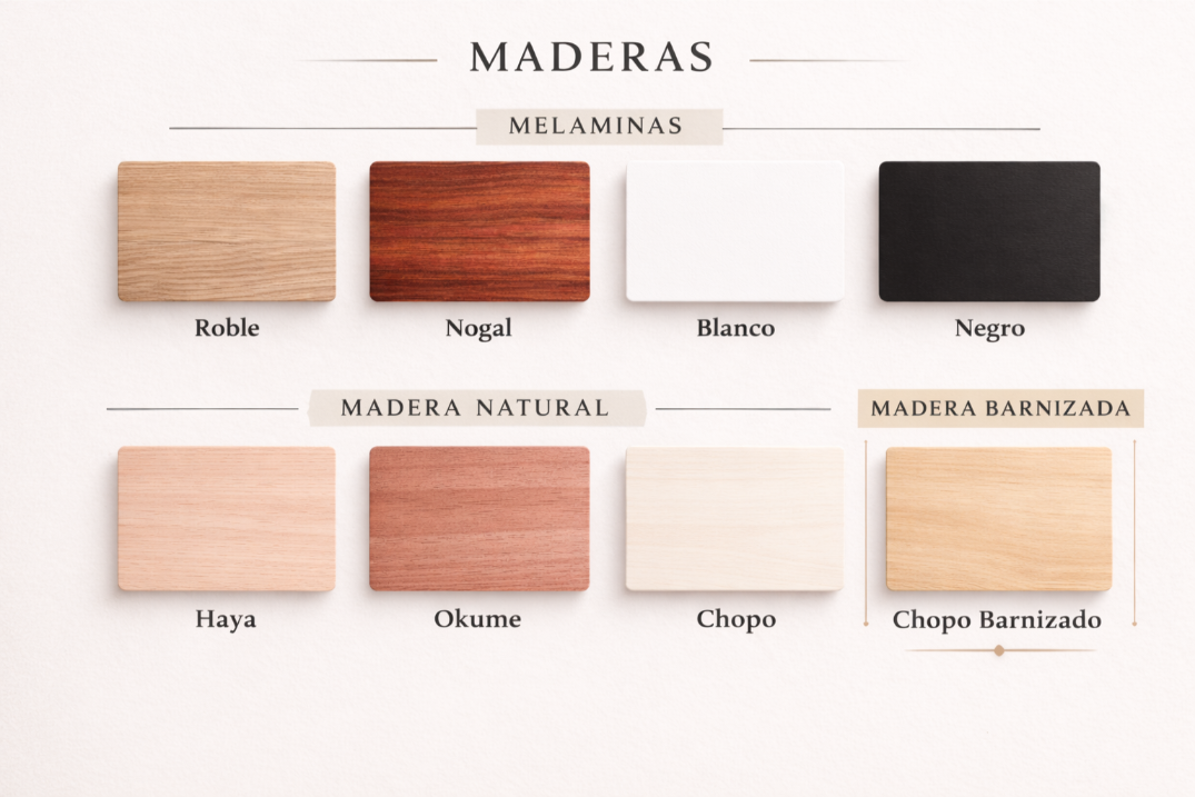| Materiales disponibles | Melamina (roble, nogal, blanco, negro — 3 mm); madera natural (okume 3 mm, chopo 4 mm, haya 4 mm); chopo barnizado 4 mm; DM pintado en colores 3 mm |