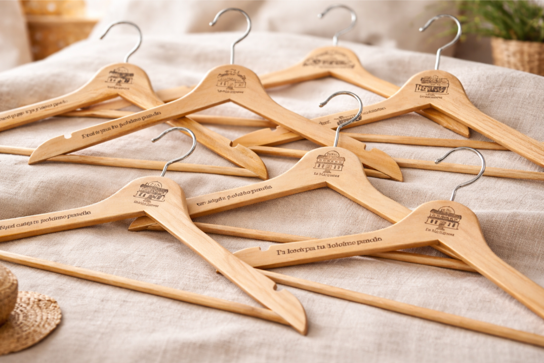 En el sector de la hospitalidad, cada detalle cuenta para ofrecer una experiencia memorable a los huéspedes. Las perchas con logo en una casa rural o en un alojamiento Airbnb son una manera sutil pero efectiva de reforzar la identidad de tu marca. Además, aportan un toque personalizado que hará que tus huéspedes sientan que se cuida cada aspecto de su estancia.