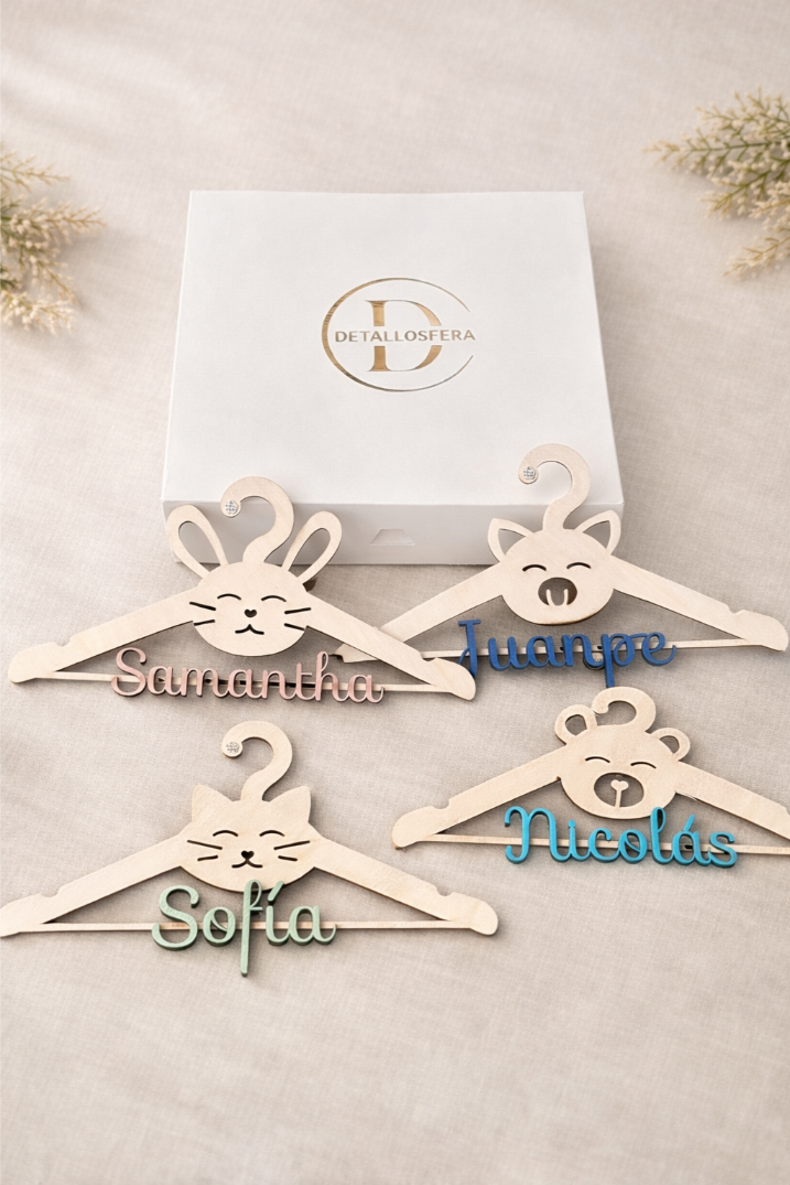 Nuestras perchas para bebés se pueden personalizar con nombres, colores y detalles especiales, lo que las convierte en un regalo perfecto para baby showers, bautizos o cualquier ocasión especial.