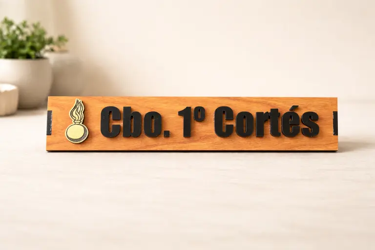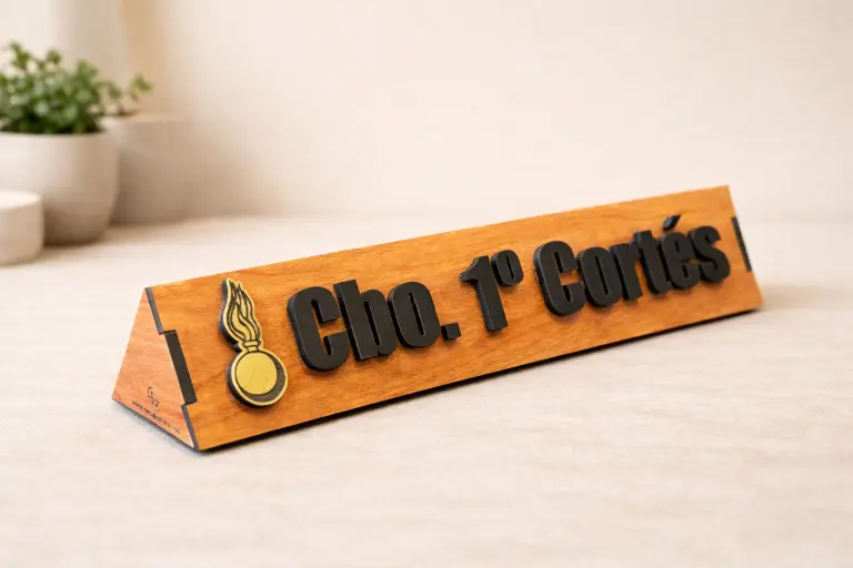 Un escritorio profesional cuenta una historia: habla de quién trabaja ahí, de su responsabilidad y de su identidad dentro de una organización. Sin embargo, la mayoría de identificadores de sobremesa disponibles en el mercado no están a la altura de esa historia. Las placas de plástico o acrílico genéricas transmiten provisionalidad; los grabados planos sobre madera barata carecen del volumen necesario para resultar legibles a distancia; y las opciones importadas en masa no permiten incluir emblemas específicos, rangos militares o logotipos corporativos con el nivel de detalle que cada profesional necesita. Esa frustración de no encontrar un identificador de escritorio personalizado con nombre que combine calidad, presencia y personalización real es exactamente lo que esta placa resuelve.