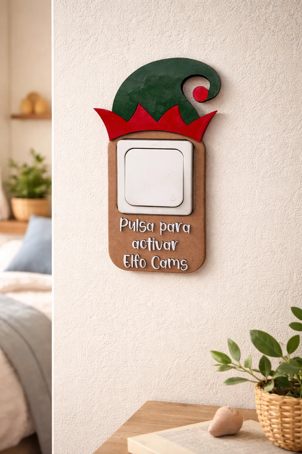 La parte superior forma un gorro de elfo con movimiento y volumen visual, y la parte inferior enmarca el interruptor con un mensaje en relieve que añade personalidad y un toque humorístico. - Instalarlo es sencillo: se coloca alrededor del interruptor existente, sin necesidad de herramientas complejas, y transforma al instante la entrada o cualquier estancia del hogar.