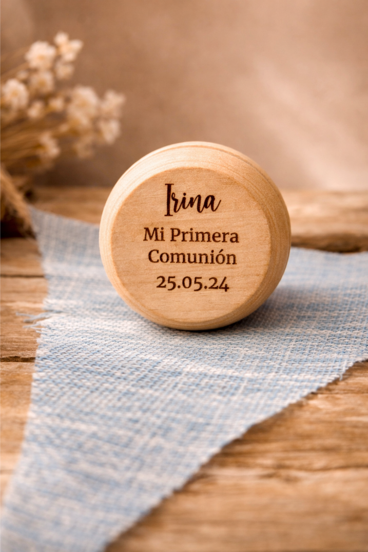 Cómo resultado tendrás un yoyó donde pone el nombre del niño/a al que se lo entregas y por otro lado los datos del evento: comunión, bautizo, fiesta de cumpleaños…